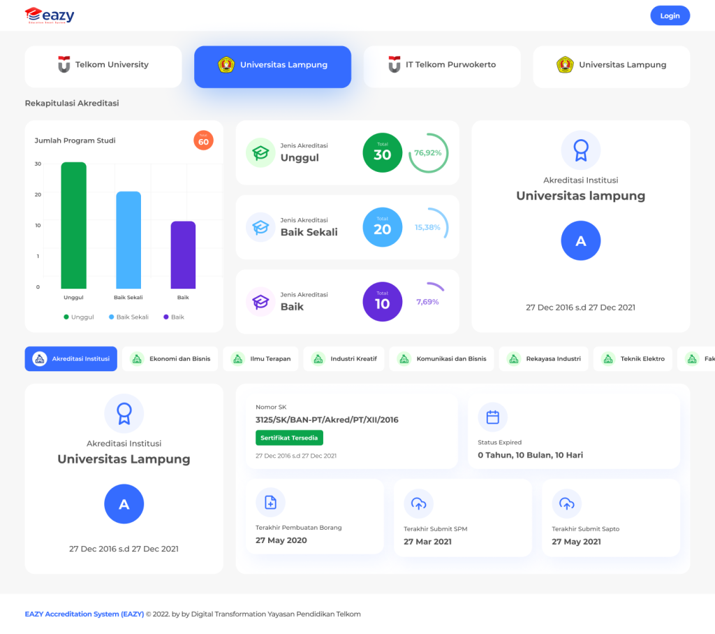 Eazy Akreditasi membantu pengelolaan dokumen akreditasi dan juga dapat membantu meningkatkan akreditasi program studi dan perguruan tinggi. Eazy Akreditasi sudah comply dengan BAN PT, LAM Teknik, LAM SAMA, LAM Infokom, LAM EMBA, LAMDIK.